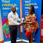 Flow’s Marketing Manager, Shand Merchant, presents a Samsung Galaxy A07 smartphone to Ms. Jessica Green, Co‑committee Chair and Trainer, as a prize for the...