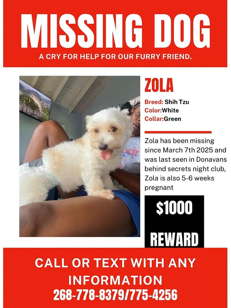 Anyone who may have seen Zola or knows where she might be is asked to call or text 268-778-8379 or 268-775-4256.