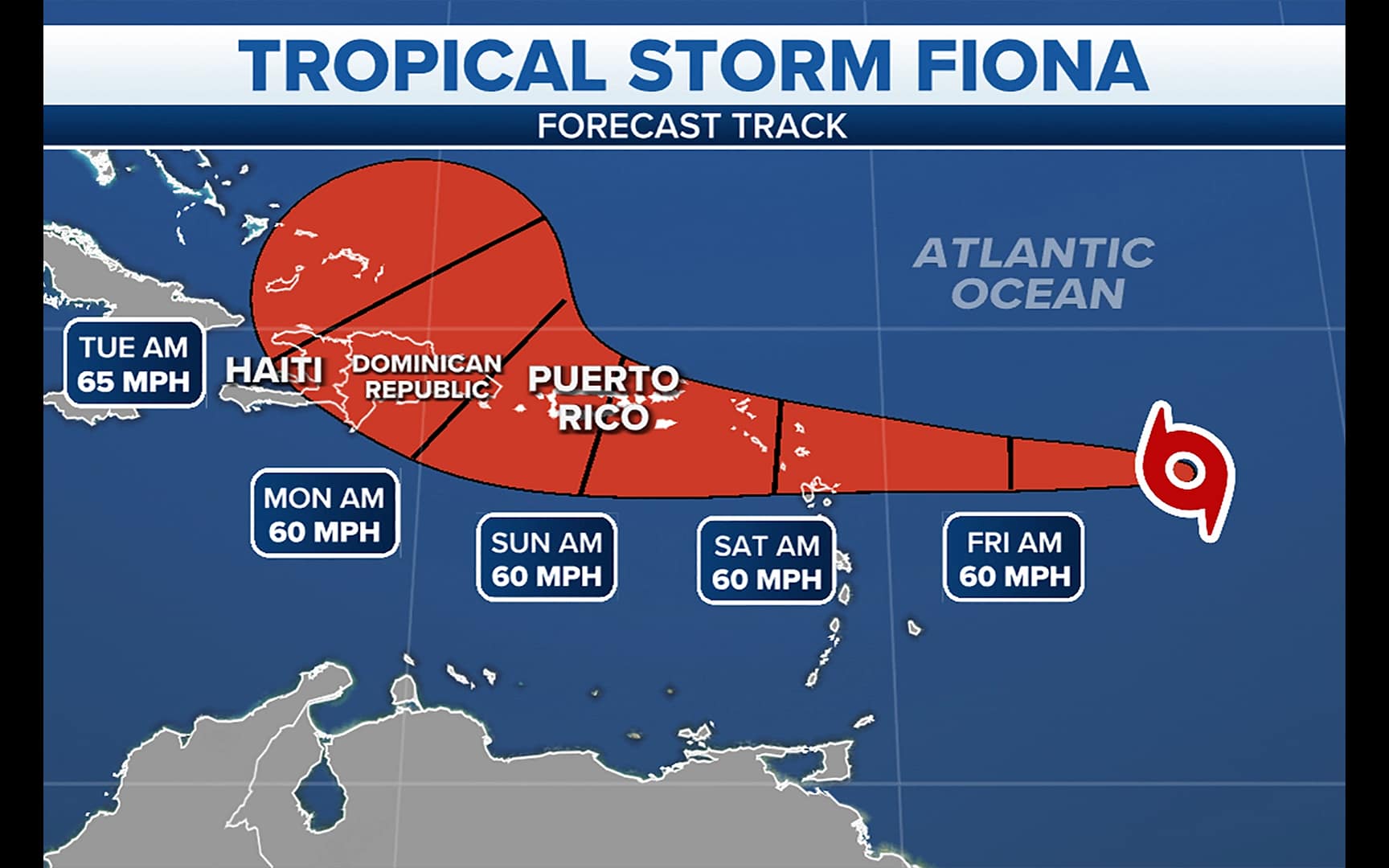 followed by a turn toward the west-northwest and northwest Sunday and Sunday night. On the forecast track, the center of Fiona is expected to move across the Leeward Islands tonight, near or just south of the Virgin Islands and Puerto Rico Saturday into Sunday, and approach the southern coast of the Dominican Republic Sunday night and early Monday.