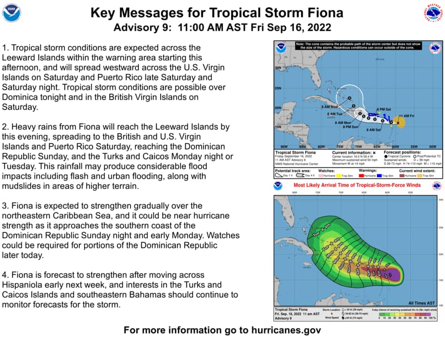 At 1100 AM AST (1500 UTC), the center of Tropical Storm Fiona was located near latitude 16.0 North, longitude 59.4 West. Fiona is moving toward the west near 14 mph (22 km/h).