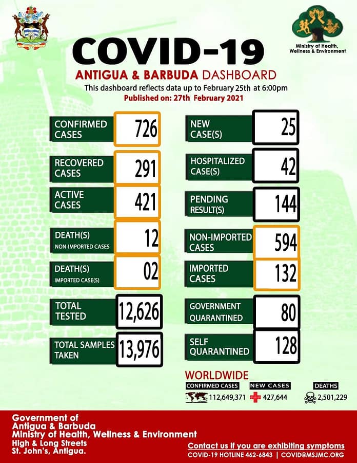 The most recent reports received by the Ministry of Health, Wellness and the Environment from the Mount St. John’s Medical Centre (MSJMC) and the Caribbean Public Health Agency (CARPHA) have revealed twenty-five (25) new laboratory confirmed COVID-19 cases in Antigua and Barbuda as of Thursday 25th February 2021 at 6pm.