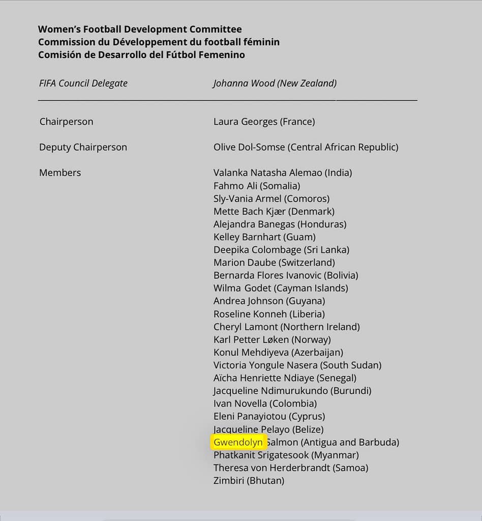 The Antigua and Barbuda Football Association (ABFA) has proudly announced the appointment of Gwen Salmon to the FIFA Women’s Football Development Committee for the 2025–2029 term.