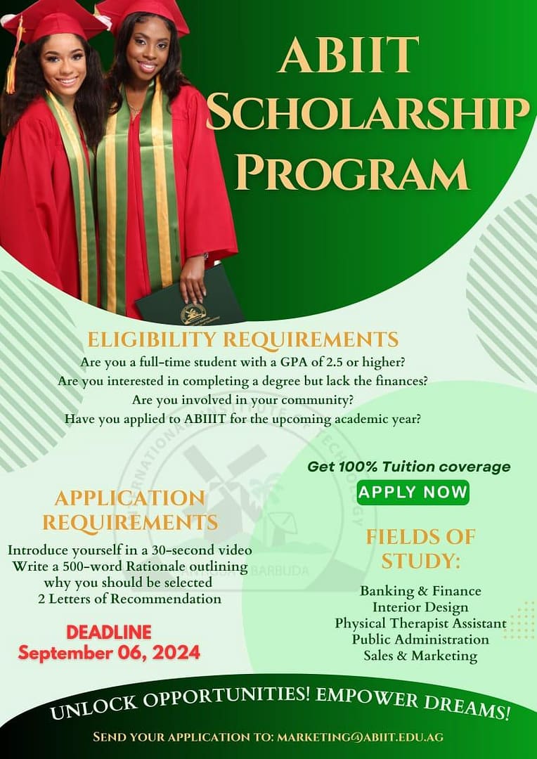 Application forms can be found on the ABIIT website at www.abiit.edu.ag. All applications must be submitted by September 6, 2024. Successful applicants will be notified by September 13, 2024. For more information contact the Registrar office at (268) 480-2448.
