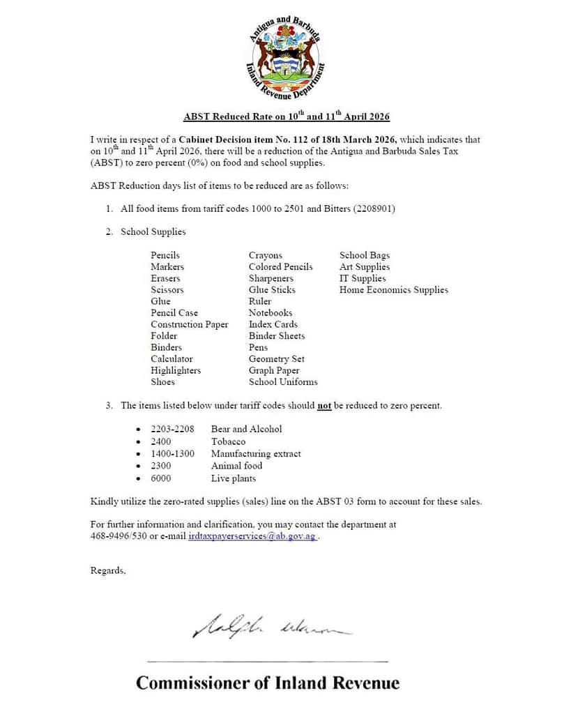 I write in respect of a Cabinet Decision Item No. 112 of 18th March 2026, which indicates that on 10th and 11th April 2026, there will be a reduction of the Antigua and Barbuda Sales Tax (ABST) to zero percent (0%) on food and school supplies.