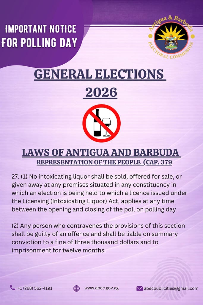 The Antigua and Barbuda Electoral Commission has reminded the public that the sale and distribution of alcohol will be strictly prohibited during polling hours on Election Day, in accordance with national law.