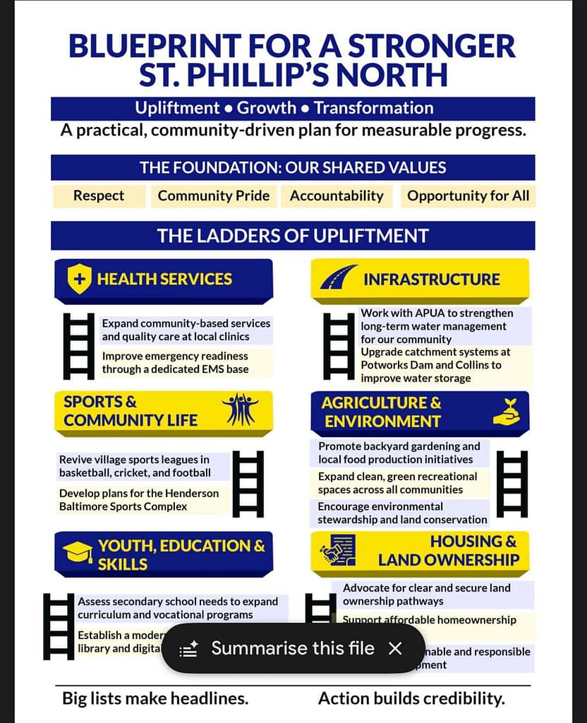 The document, titled “Blueprint for a Stronger St. Philip’s North,” presents what Browne describes as a community-driven development plan centered on upliftment, growth and transformation within the constituency.