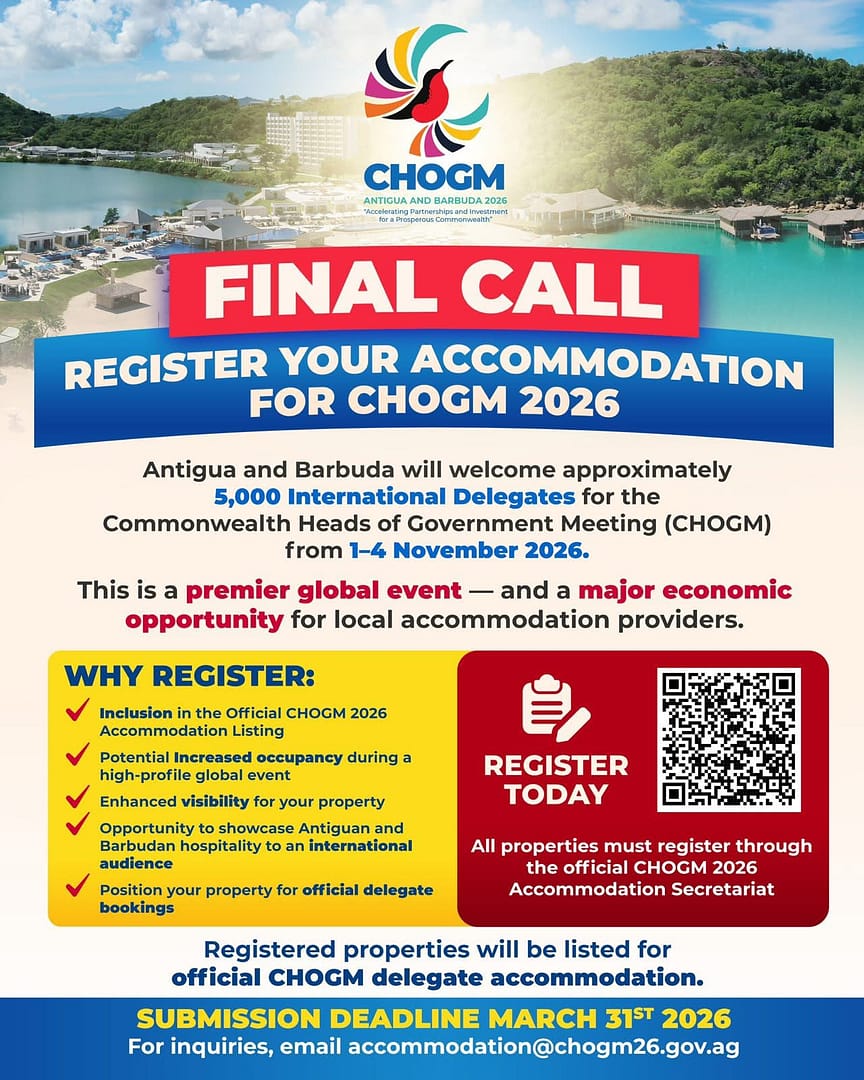 ST. JOHN’S, Antigua — Authorities are urging accommodation providers to register their properties for the 2026 Commonwealth Heads of Government Meeting (CHOGM), as the country prepares to host thousands of international delegates later this year.