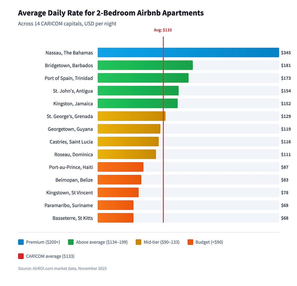 Average daily rates for two-bedroom Airbnb apartments vary significantly across Caribbean capitals, ranging from $345 in Nassau, The Bahamas to $68 in Basseterre, Saint Kitts and Nevis – a significant gap that segments the region into distinct pricing tiers.