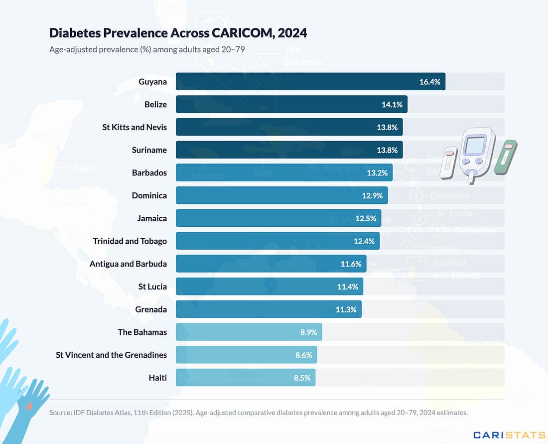 Diabetes prevalence across CARICOM ranges from 8.5% in Haiti to 16.4% in Guyana – a nearly twofold difference across a single regional bloc. The 2025 International Diabetes Federation (IDF) Diabetes Atlas provides comparable estimates for 14 CARICOM states, adjusted for age structure so that countries with younger and older populations can be compared on equal footing.