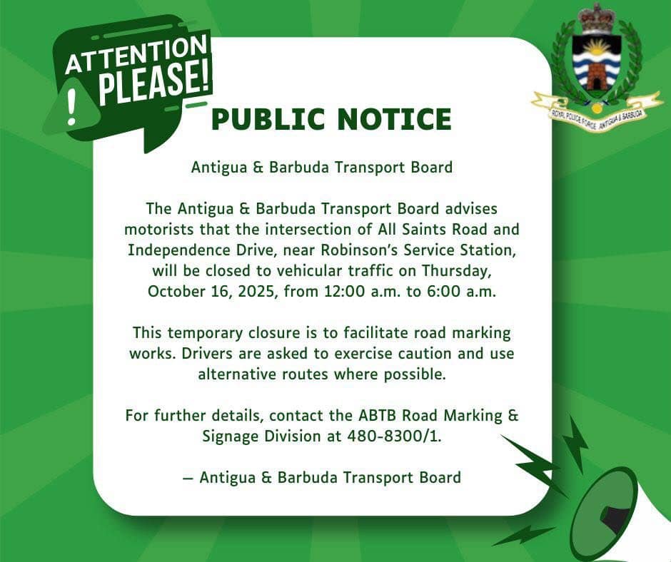 The Antigua & Barbuda Transport Board has issued a public notice advising motorists that the intersection of All Saints Road and Independence Drive, near Robinson’s Service Station, will be closed to vehicular traffic on Thursday, October 16, 2025, from 12:00 a.m. to 6:00 a.m.