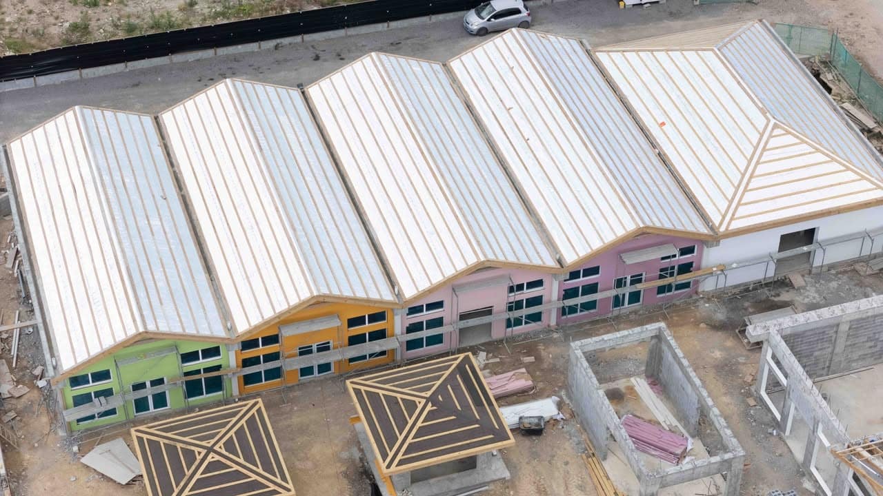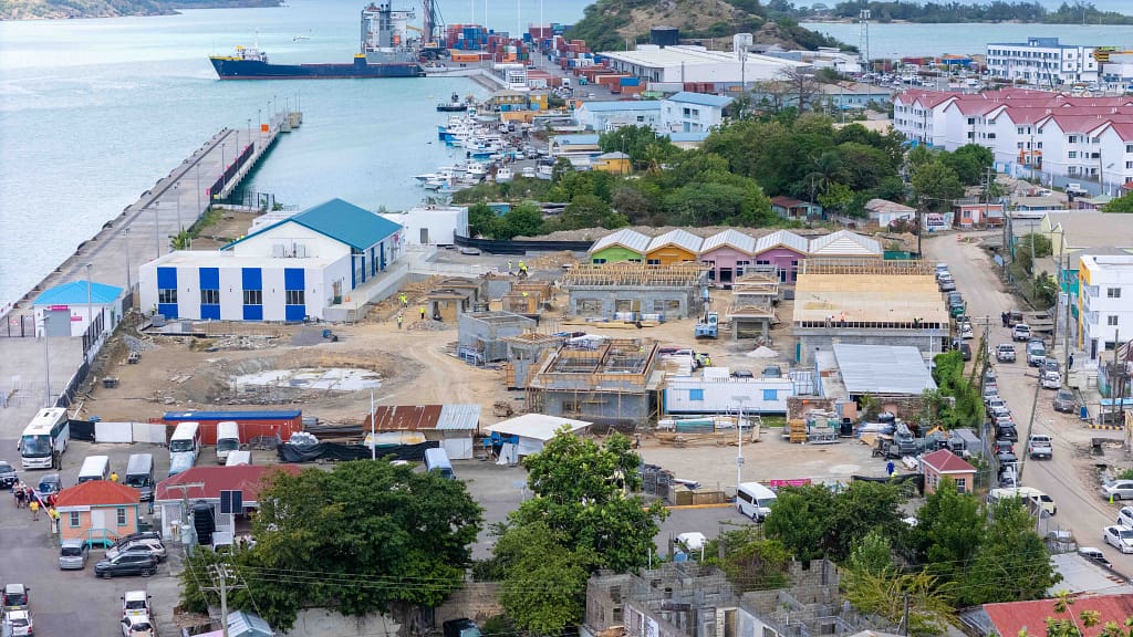 According to an update from Antigua Cruise Port, multiple buildings are also progressing, with exterior finishes taking shape as brightly coloured facades are added to the landscape. The design draws on Caribbean themes, including the installation of signature blue rooftops inspired by the surrounding sea.