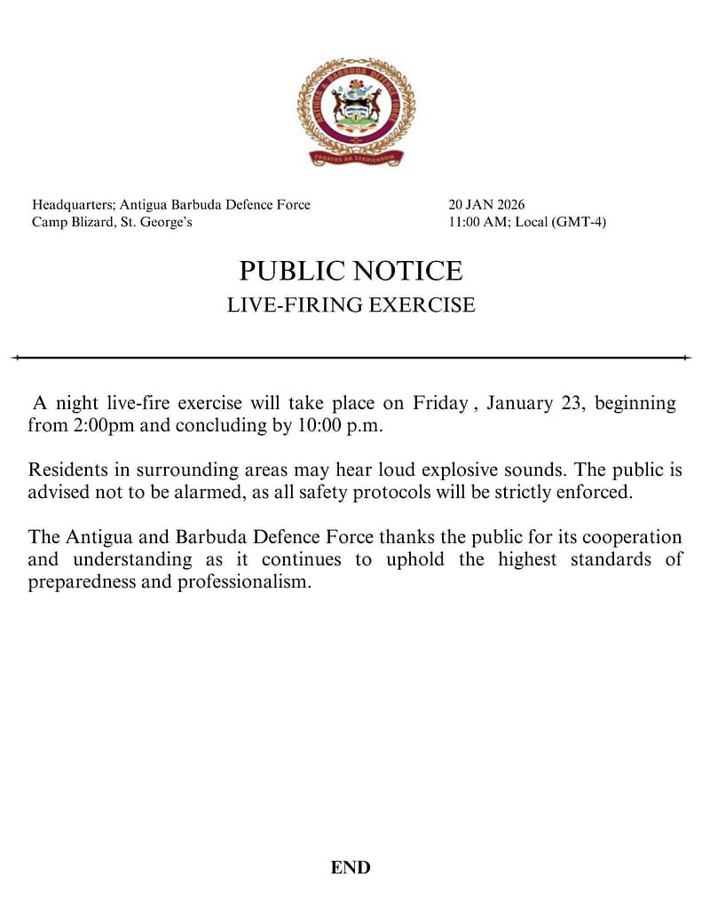 The Antigua and Barbuda Defence Force (ABDF) has announced plans to conduct a live-firing military exercise later this week.