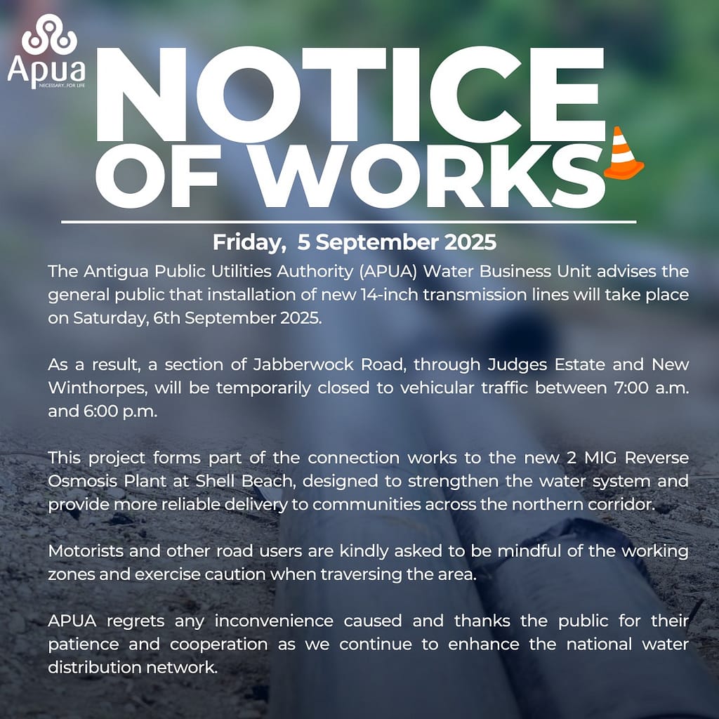 APUA has urged motorists to exercise caution near work zones and apologised for any inconvenience.