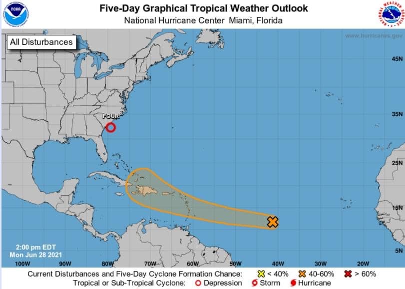 National Hurricane Center predicts some possibly slow development of this disturbance after the middle of the week while the system moves westward to west-northwestward at 15 to 20 mph.