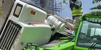 Driver escapes serious injury when cement-mixer truck overturns on construction site...
