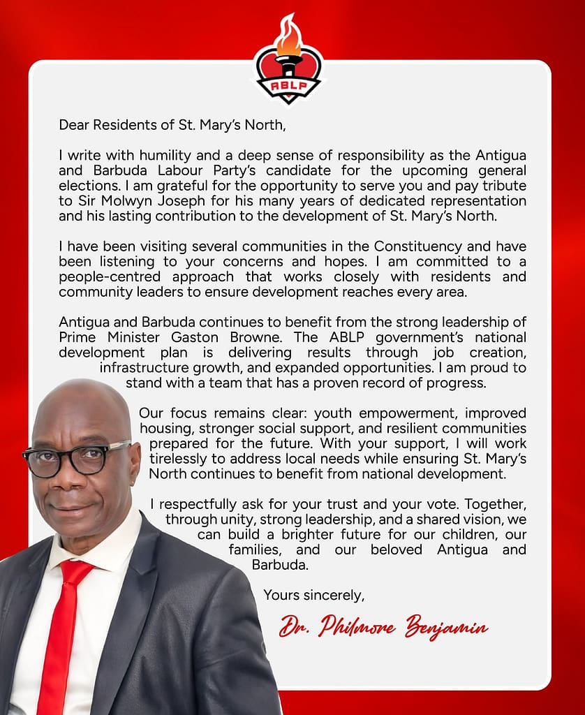 I write with humility and a deep sense of responsibility as the Antigua and Barbuda Labour Party’s candidate for the upcoming general elections. I am grateful for the opportunity to serve you and pay tribute to Sir Molwyn Joseph for his many years of dedicated representation and his lasting contribution to the development of St. Mary’s North.
