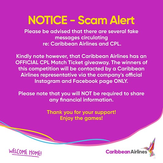 Caribbean Airlines – It has come to our attention that persons have been receiving messages via our Social Media pages prompting them to share information to claim prizes for our CPL ticket giveaway.