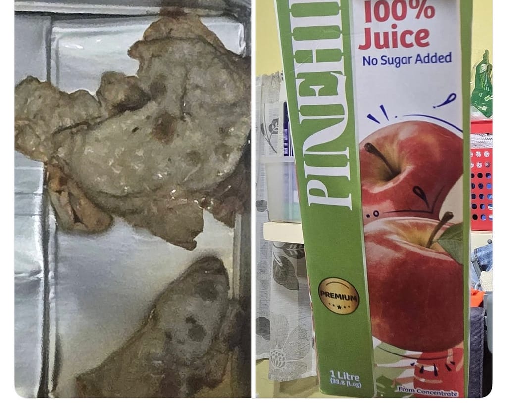 The complaint was shared in a local customer service forum, where the individual said the substance was found at the bottom of a one-litre Pinehill apple juice carton. The product was marked with an expiry date of August 1, 2026, and a batch code listed as EY 22:41:21.
