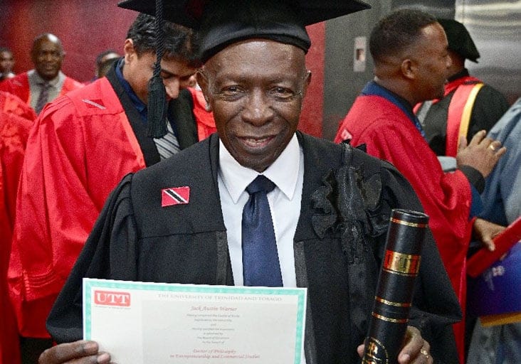 Former government minister and ex-FIFA vice president Jack Warner received a standing ovation as he graduated with a PhD from the University of Trinidad and Tobago (UTT) on Monday.
