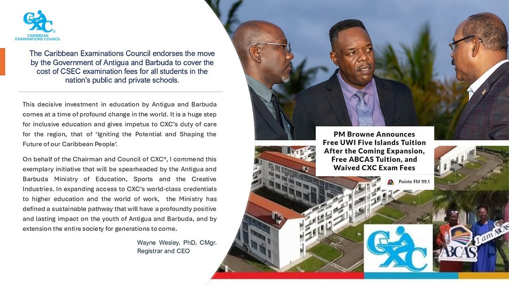 The Caribbean Examinations Council (CXC) has endorsed the Government of Antigua and Barbuda’s decision to fund CSEC examination fees for all students across public and private schools, describing the move as a major step toward strengthening access to quality education.