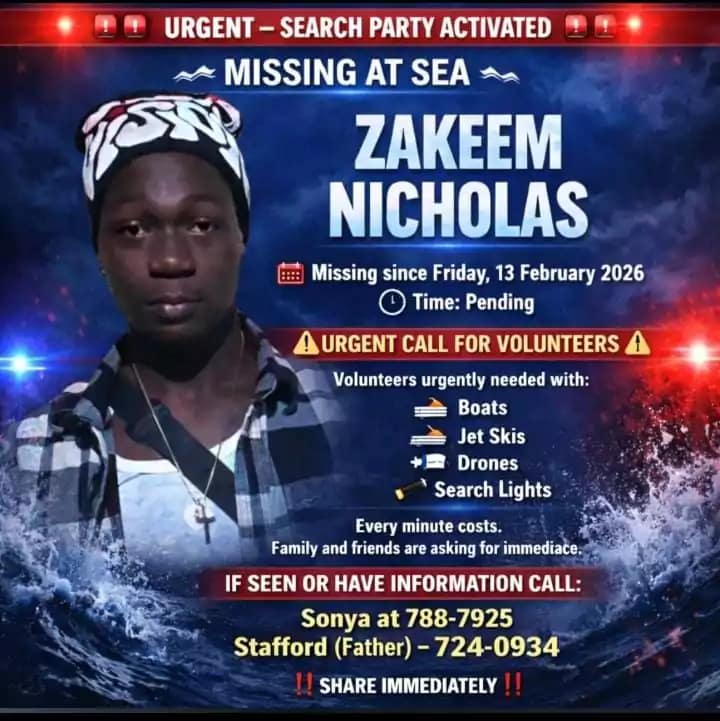 Relatives and volunteers have stepped up search efforts for Zakeem Nicholas, who has been missing at sea since Friday, February 13, 2026.