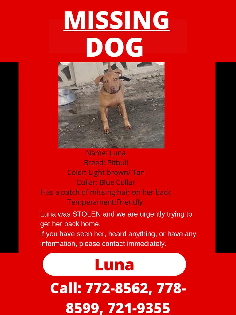 Luna, a light-brown pitbull, was last seen wearing a blue collar. She has a distinctive patch of missing hair on her back and is described as very friendly. Her owners say they are “extremely worried” about her wellbeing.