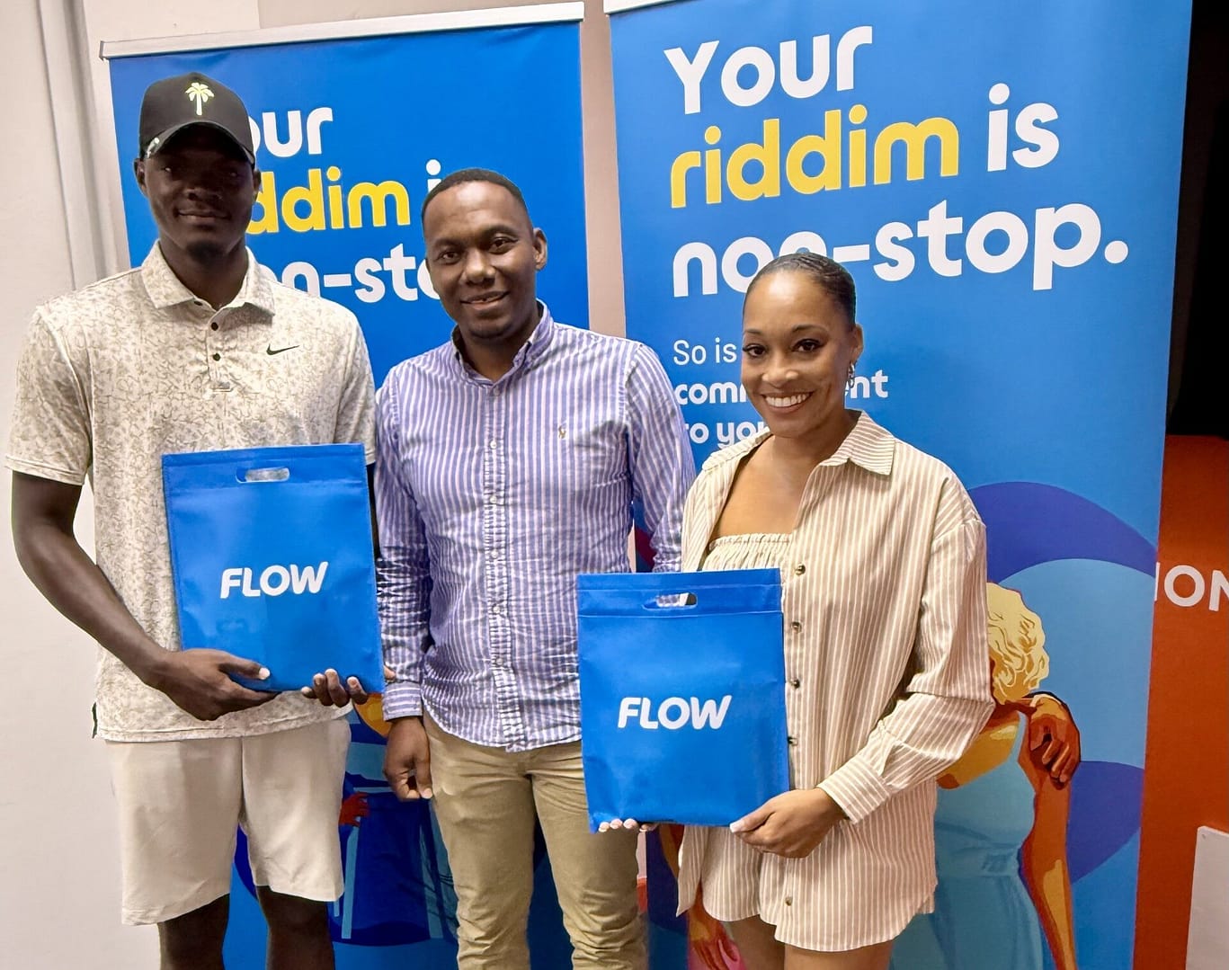 Sportsman of the Year Alzarri Joseph and Sportswoman of the Year Melissa Seaforth recently visited Flow’s Antigua and Barbuda office to receive their prize of one year of postpaid mobile service, awarded in recognition of their outstanding national achievements. Wayne Hull, Country Manager of Flow Antigua and Barbuda, welcomed the champions and presented them with Flow gift bags filled with branded items. The athletes expressed their excitement at joining the Flow family, and Wayne congratulated them on their accomplishments, officially welcoming them to Flow as they help keep the riddim flowing.