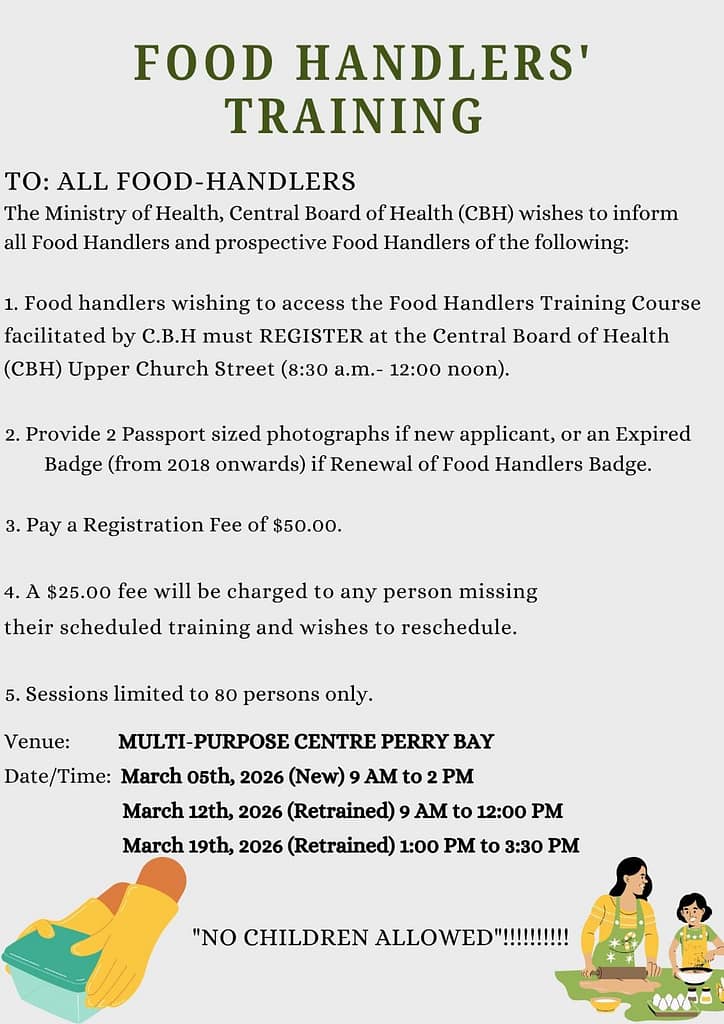 The Ministry of Health, through the Central Board of Health (CBH), has announced new Food Handlers’ Training sessions scheduled for March, urging all food handlers and prospective applicants to register ahead of time.