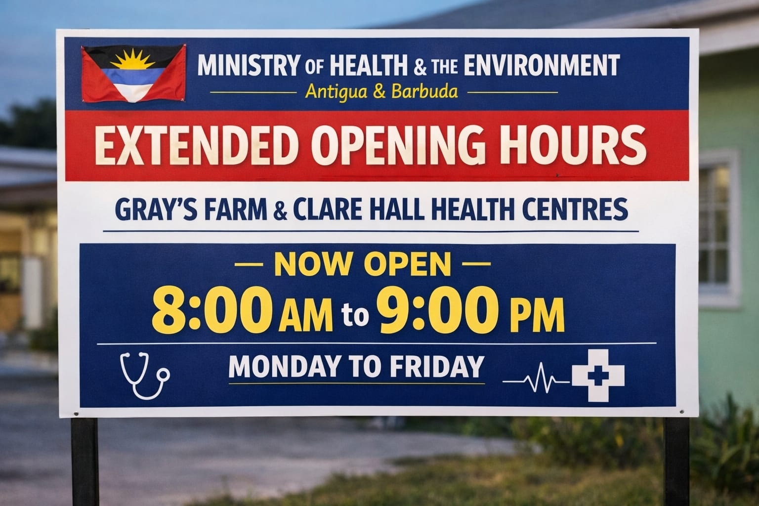 Effective April 13, 2026, the Gray’s Farm Health Centre and the Clare Hall Health Centre will operate extended hours from 8:00 a.m. to 9:00 p.m., Monday through Friday, expanding access to essential primary healthcare services for residents, particularly during the evening hours.
