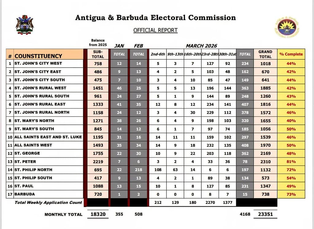 Nearly half of eligible voters in Antigua and Barbuda have yet to renew their voter identification cards, according to the latest data released by the Antigua and Barbuda Electoral Commission (ABEC), raising concerns about preparedness ahead of the next general election.