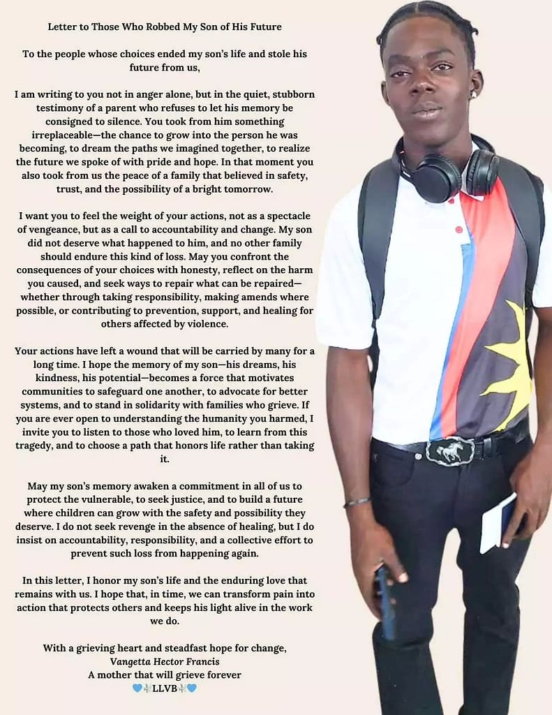 In the letter, titled “To Those Who Robbed My Son of His Future,” Vangetta Hector Francis describes her grief and the loss of her son’s hopes and ambitions.