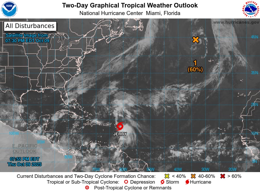 Forecasters said Jerry is expected to turn northwest later tonight, with a slightly slower northward motion Friday and Saturday. The system could bring 4 to 6 inches of rain across Barbuda and 2 to 4 inches elsewhere in the Leewards, raising the risk of flash flooding in low-lying and mountainous areas.