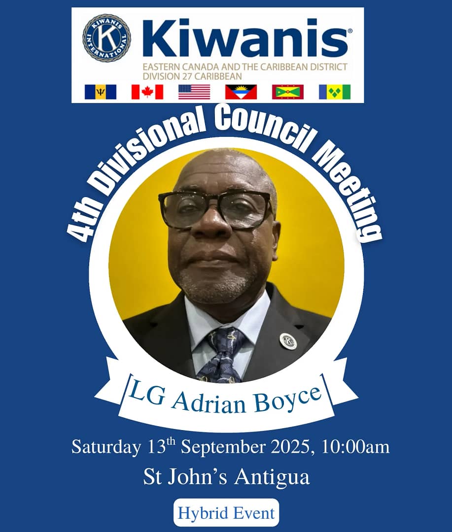 The Kiwanis Clubs of Antigua and Barbuda are pleased to announce that regional delegates will converge in Antigua for the fourth quarterly Divisional Council Meeting (DCM) for Division 27. The DCM will be hosted on Saturday, September 13, 2025.
