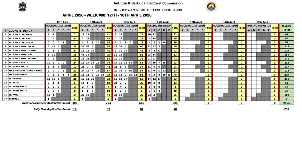 The Antigua & Barbuda Electoral Commission says more than half of eligible voters have now completed the replacement of their voter identification cards, according to its latest official report for April 2026.