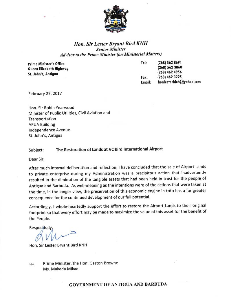 It is hoped that the private ownership of lands within the footprint of the airport will be resolved, even as was implored by letter of the National Hero, Sir Lester Bird, before his passing.