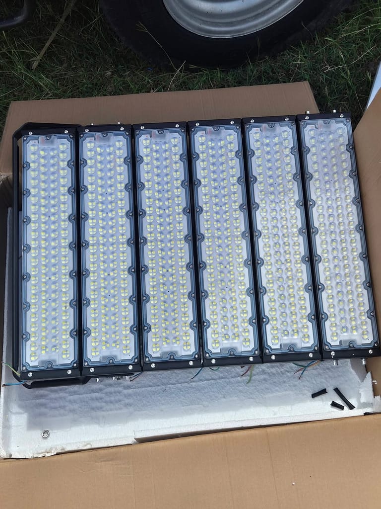 The installation includes multiple high-powered LED lighting units mounted on poles around the field.