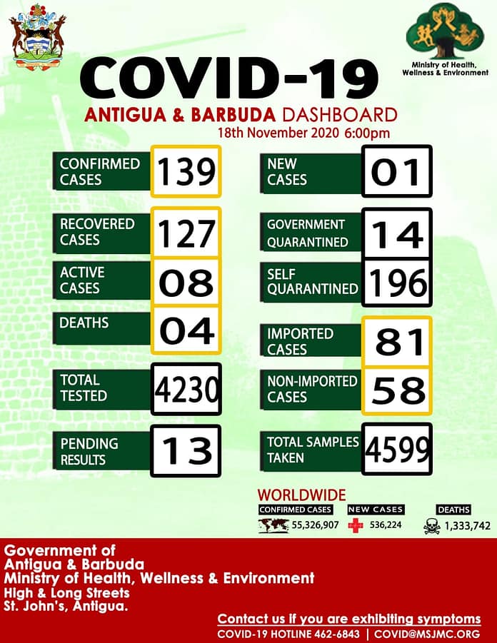 The most recent report received by the Ministry of Health, Wellness and the Environment from the Mount St. John’s Medical Center (MSJMC) has revealed one new laboratory confirmed COVID-19 case in Antigua and Barbuda as of Tuesday 17th November 2020 at 6pm.