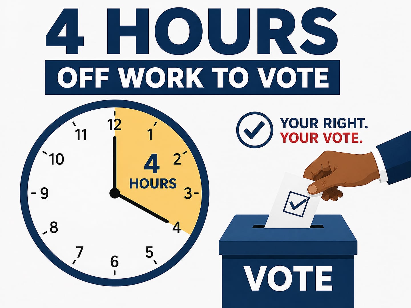 I believe the law is clear that employees must be given 4 consecutive hours on polling day to vote, without any loss of pay, penalty, or interference.