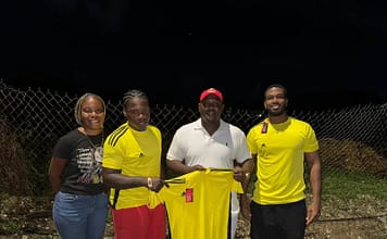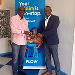 Wayne Hull, Country Manager of Flow Antigua and Barbuda, presents a Samsung S25 smartphone to cricket legend Sir Richie Richardson in support of the...