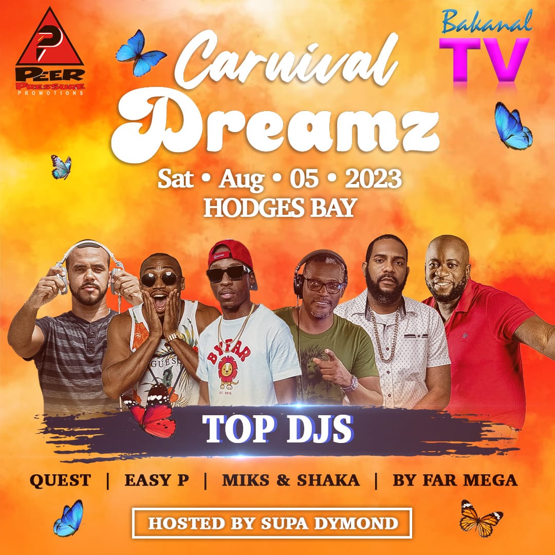 Ready for your tickets? VIP tickets (super-premium drinks and food inclusive) are only EC $300, while General tickets (premium drinks inclusive) are just EC $200; food will be on sale in General. Get your tickets at convenient locations such as Solange & Sunny, Tropic Wear (Levi’s), North 268, ToyBox, Gloria’s Beauty Salon or online at TickeTing (link to: https://bit.ly/CarnivalDreamz). Cabanas are reservation only, so contact (268) 726-6769 to check their availability.