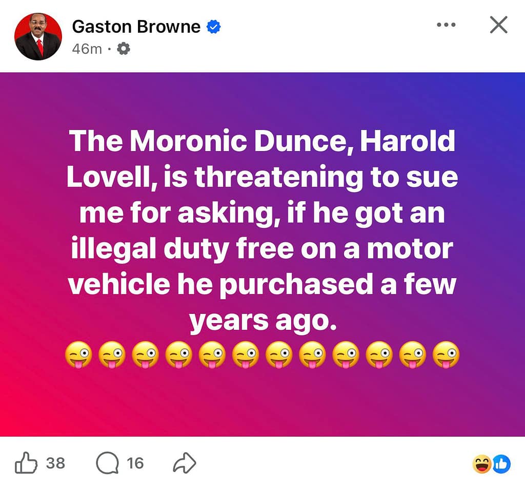 In a Facebook post on Wednesday, Browne mocked Lovell’s announcement that he intends to sue, framing the threat as political theatrics. The Prime Minister questioned whether Lovell improperly received duty-free concessions on a vehicle purchased several years ago, prompting the former finance minister to accuse Browne of defamation.