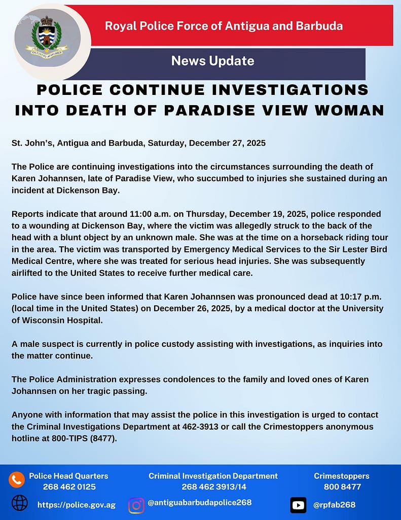 Reports indicate that around 11:00 a.m. on Thursday, December 19, 2025, police responded to a wounding at Dickenson Bay, where the victim was allegedly struck to the back of the head with a blunt object by an unknown male. She was at the time on a horseback riding tour in the area. The victim was transported by Emergency Medical Services to the Sir Lester Bird Medical Centre, where she was treated for serious head injuries. She was subsequently airlifted to the United States to receive further medical care.