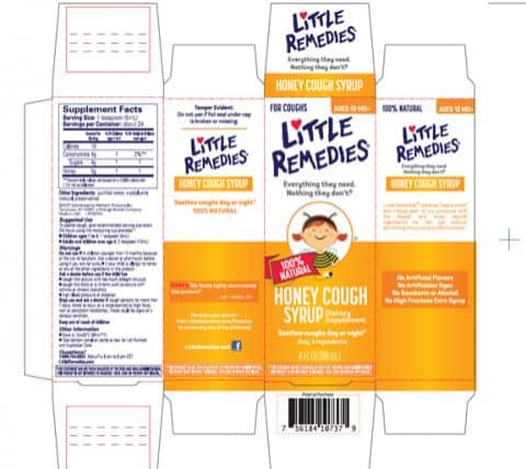 Little Remedies® Honey Cough Syrup is packaged in a 4 FL OZ (118 mL) amber bottle and is sold in an  outer carton with the Lot Code appearing both on the bottle label and on the bottom of the carton.