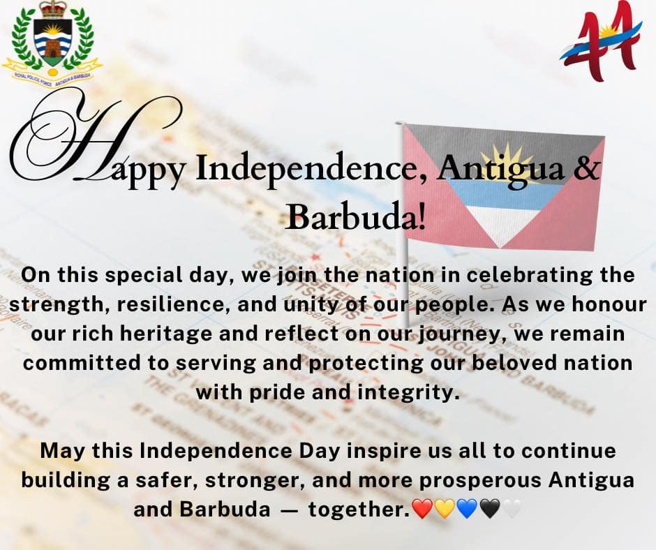 The force also called on citizens to work collectively toward a safer, stronger, and more prosperous nation. “May this Independence Day inspire us all to continue building a safer, stronger, and more prosperous Antigua and Barbuda — together,” it added.