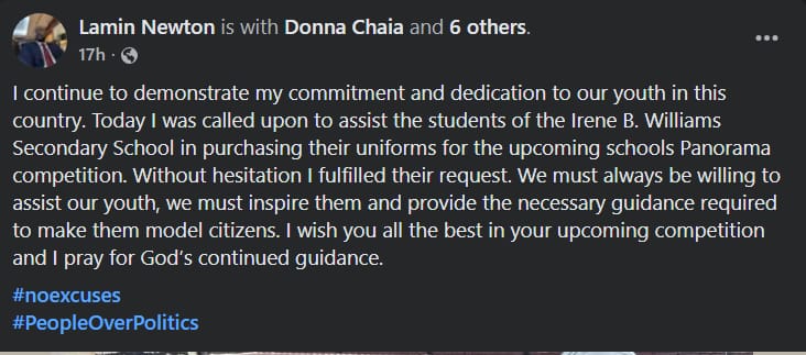 Senator Lamin Newton has extended his support to students of the Irene B. Williams Secondary School, assisting them in purchasing uniforms for their upcoming Schools Panorama competition.