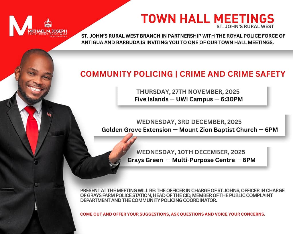 A series of town hall meetings focusing on community policing and crime prevention has been announced for St John’s Rural West. The sessions, organised by Senator Michael Joseph in partnership with the Royal Police Force of Antigua and Barbuda, aim to strengthen dialogue between residents and law-enforcement officials.