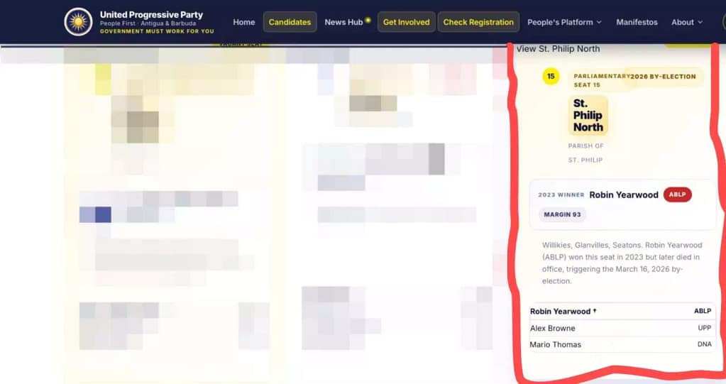 The statement, visible at www.myupp.org under the St. Philip North constituency page, reads: “Robin Yearwood (ABLP) won this seat in 2023 but later died in office, triggering the March 16, 2026 by-election.” This claim is categorically false. Sir Robin Yearwood did not die. He did not vacate his seat due to death. The statement has no basis in fact.