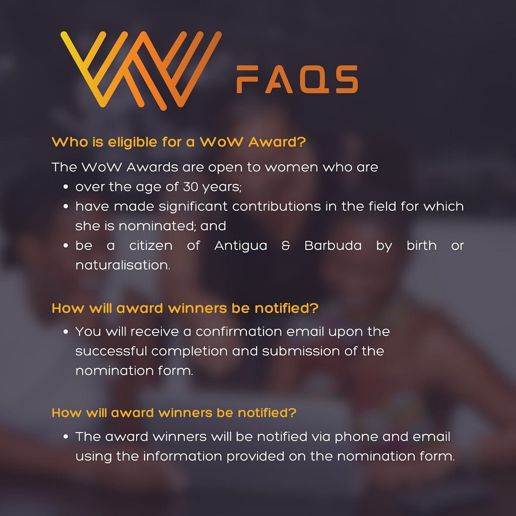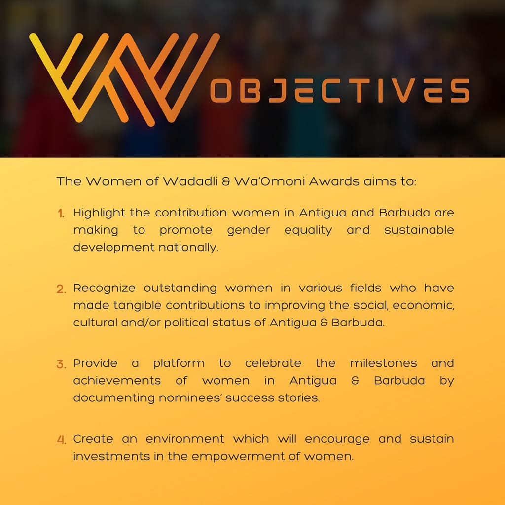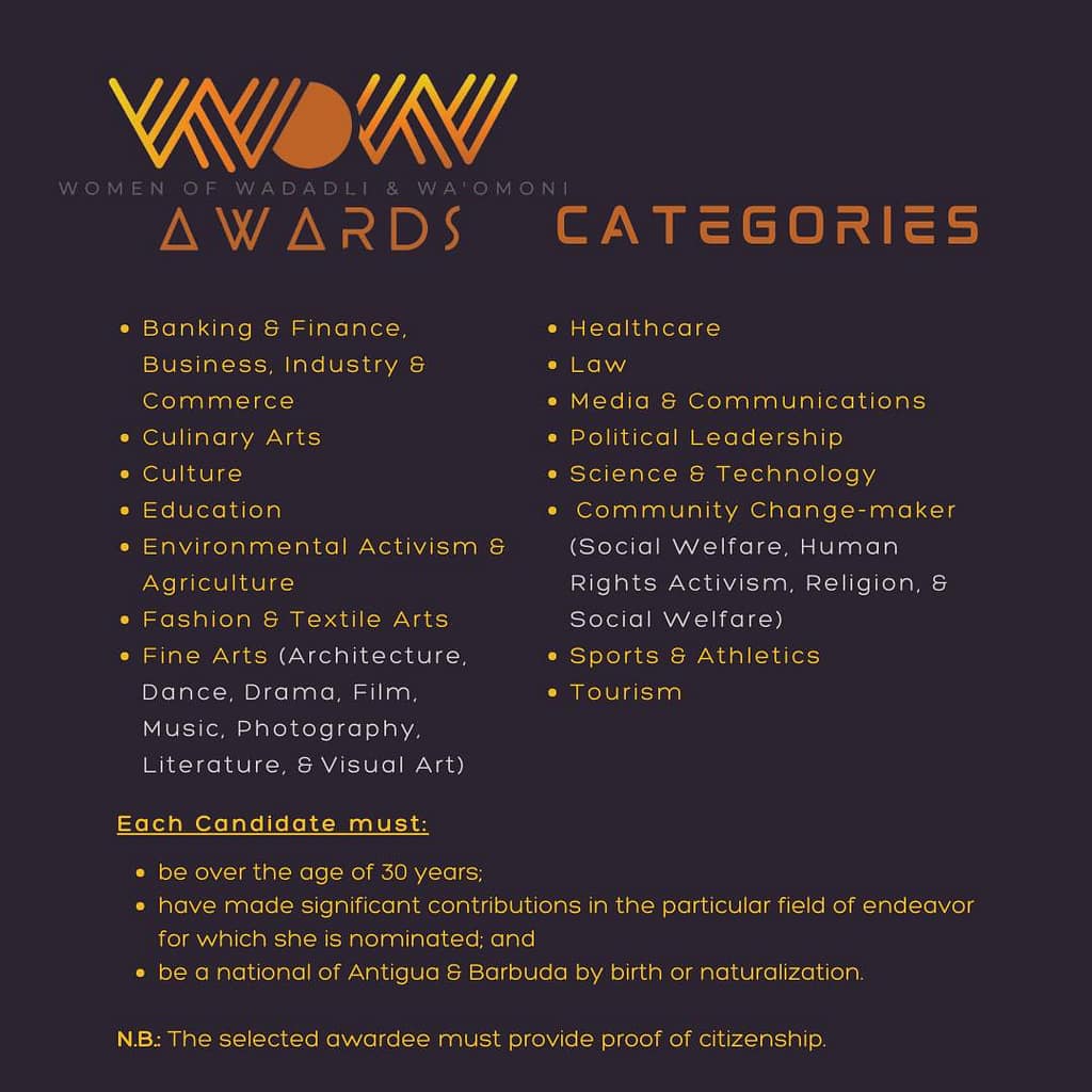 We are thrilled to announce the second instalment of the WOW Awards!! Rebranded this year as the Women of Wadadli & Wa’Omoni Awards, this prestigious event aims to recognize and honor outstanding women in various fields who have made tangible contributions to improving the social, economic, cultural and/or political status of Antigua & Barbuda.