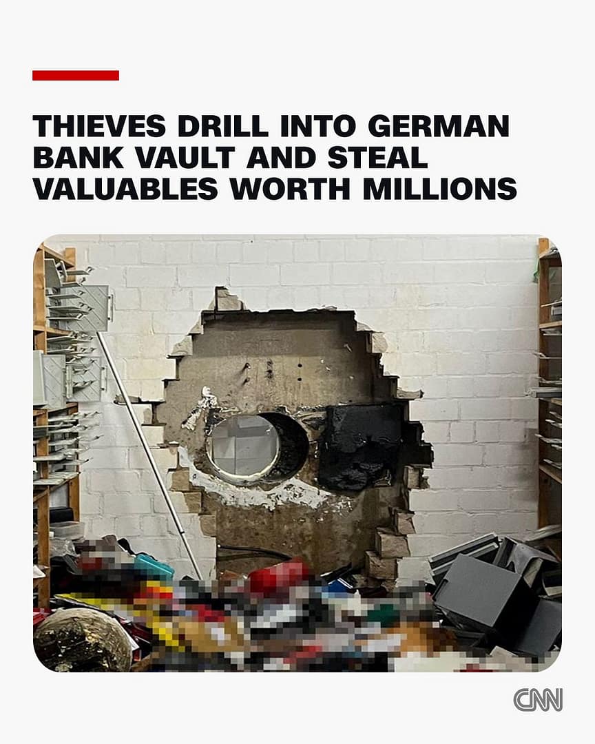Reuters — Thieves used the quiet Christmas period to drill their way into the vault of a German retail bank and make off with at least 10 million euros’ worth of money and valuables from customers’ deposit boxes, police said on Tuesday.