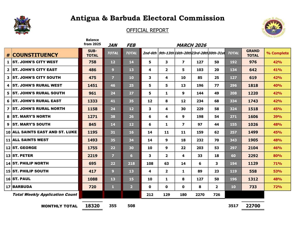 Thousands of voters moved to update or secure their identification in the final week of March following the Prime Minister’s indication that a general election could be called within 90 days, according to new data from the Antigua and Barbuda Electoral Commission.